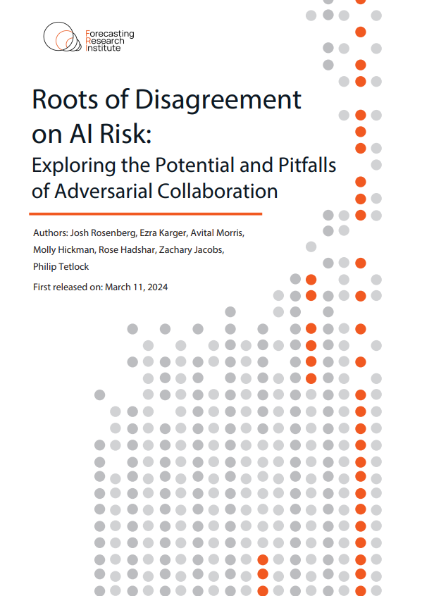 In “Roots of Disagreement on AI Risk: Exploring the Potential and Pitfalls of Adversarial Collaboration,” we describe the results of a project that brought together participants who disagreed about the risk AI poses to humanity in an adversarial collaboration. We asked participants in “AI skeptic” (mostly superforecasters) and “AI concerned” (entirely domain experts) groups to work collaboratively to find the strongest near-term cruxes: forecasting questions resolving by 2030 that would lead to the largest changes in beliefs (in expectation) about the risk of existential catastrophe by 2100. Participants made conditional forecasts on the cruxes they generated, and discussed their reasoning in an online forum and in moderated one-on-one video calls.